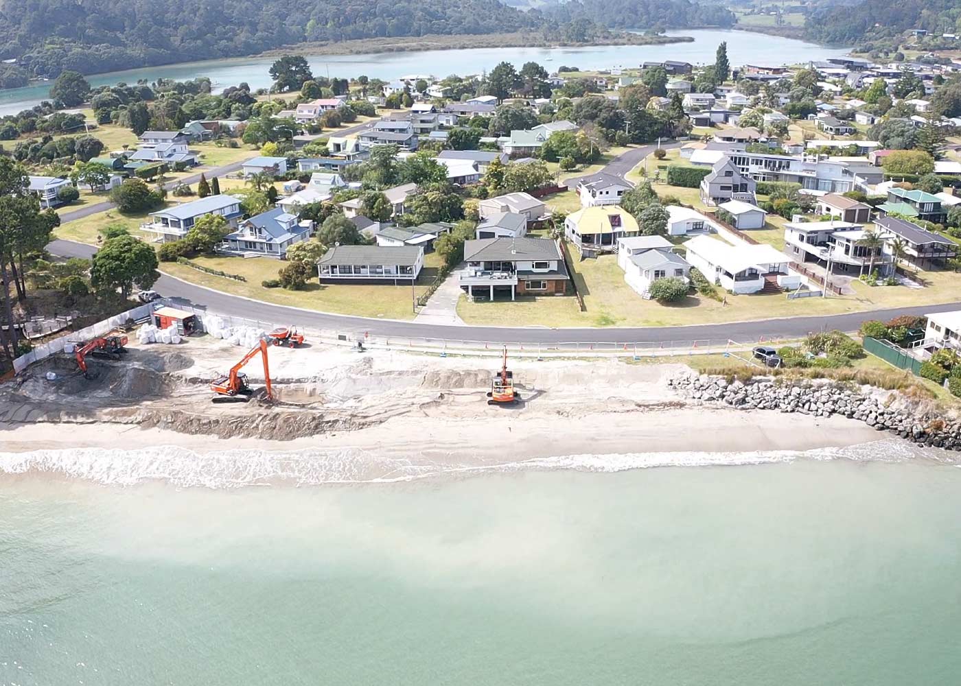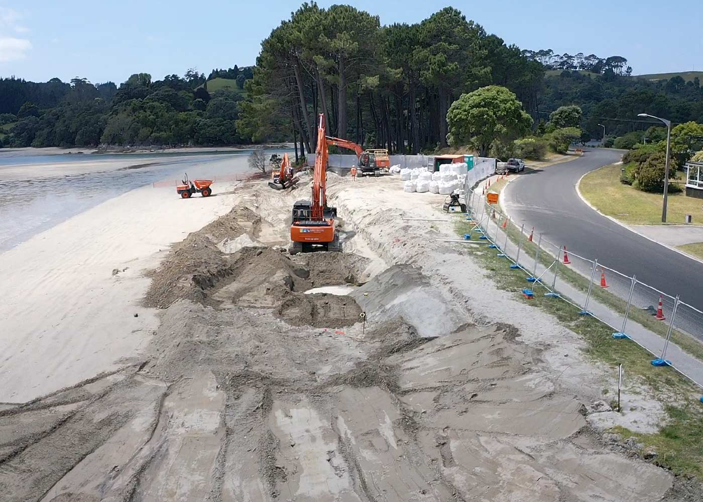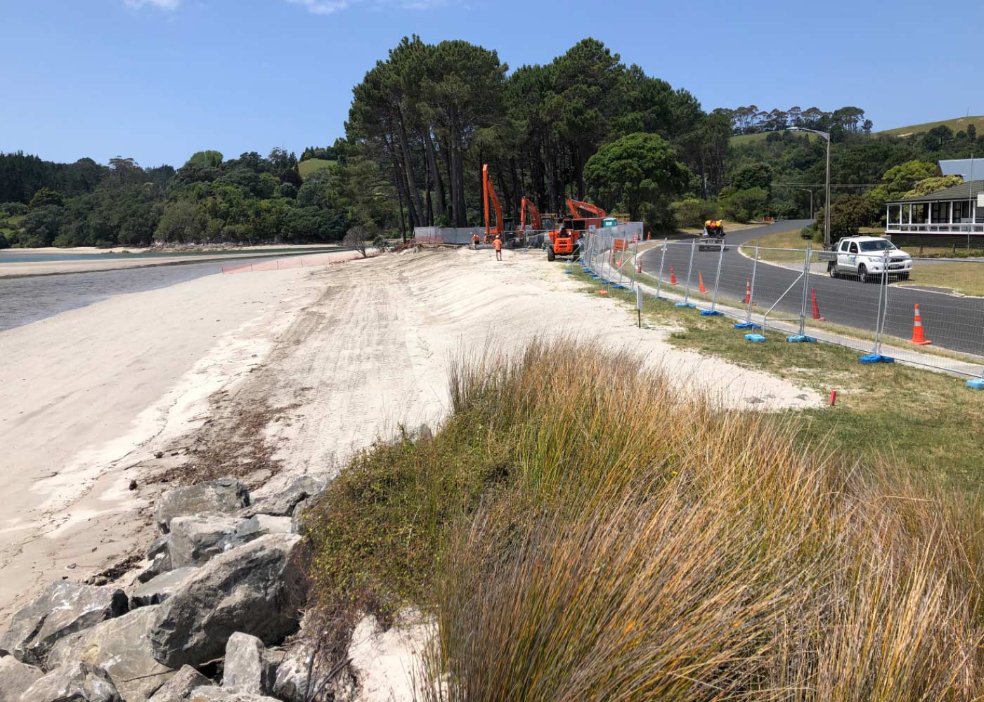 Installation of a sand-crete buried backstop wall. A buried sand-crete backstop wall was selected providing significant cost savings compared to a timber pole wall. This complemented the surrounding beach environment.