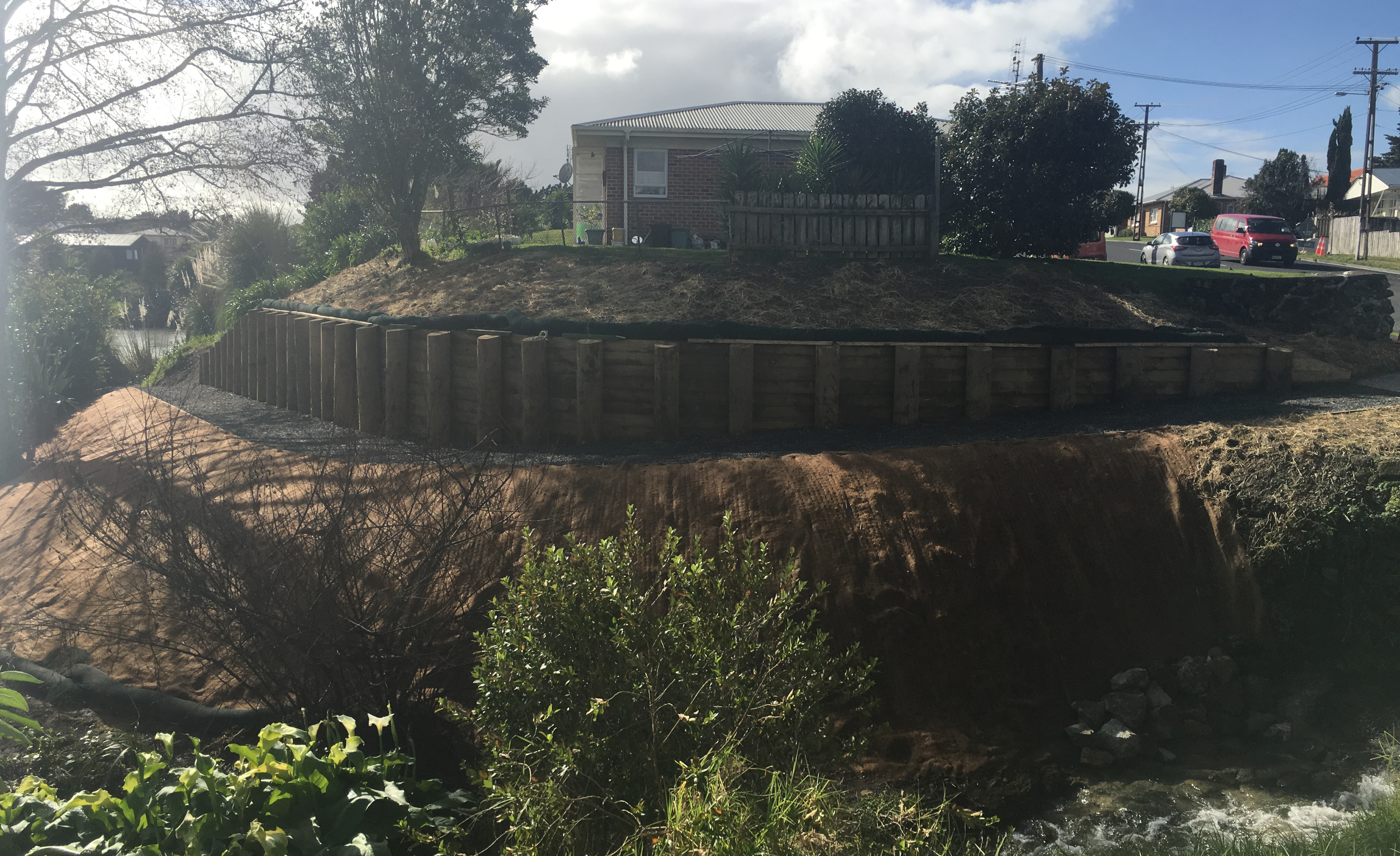 Remove existing bridge crossing over waterway. Cut a new walk way into hillside and install a timber pile retaining wall 2.4m high. Install a new walkway path.