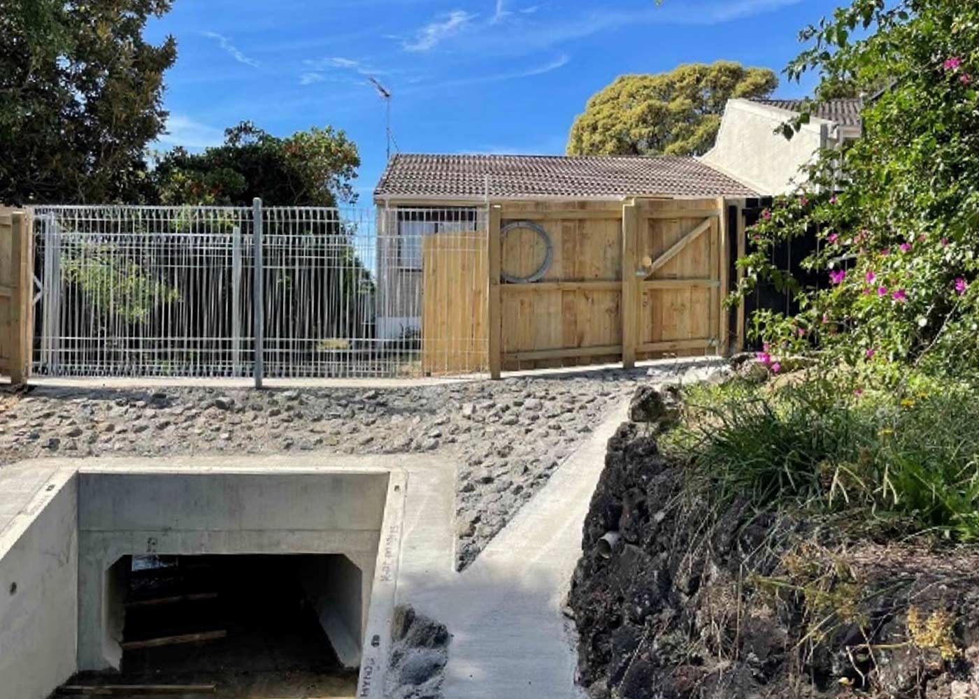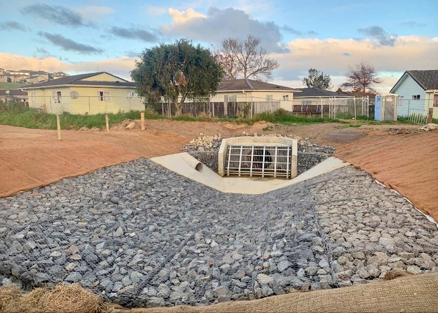 Brief scope of works involved demolition of existing outlet/inlet structures. This was in poor condition and unsafe. Formation and construction of mass outlet structure which required being poured in situ onsite. Additional design input and execution. Installation of Gabion reno mattresses. Wingwall and pipe work. Fabrication and installation of steel intake grill and platform.